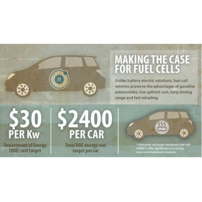 "Para que os carros a célula de combustível se tornem realidade, o DOE [Departamento de Energia dos EUA] estabeleceu um custo do sistema de US$ 30 por quilowatt, o que se traduz em cerca de US$ 2.400 por carro. Neste momento, o custo das PEMFCs é de US$ 52 por kilowatt, que é uma melhoria grande em relação a onde a tecnologia começou.