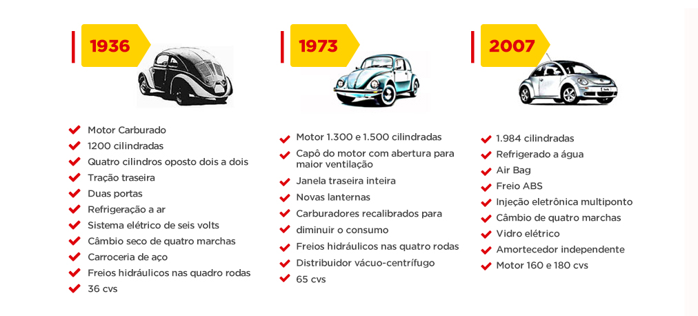 Do primeiro modelo de Fusca criado, também conhecido como “besouro”, até o último, várias mudanças podem ser identificadas. Acompanhe na imagem abaixo: